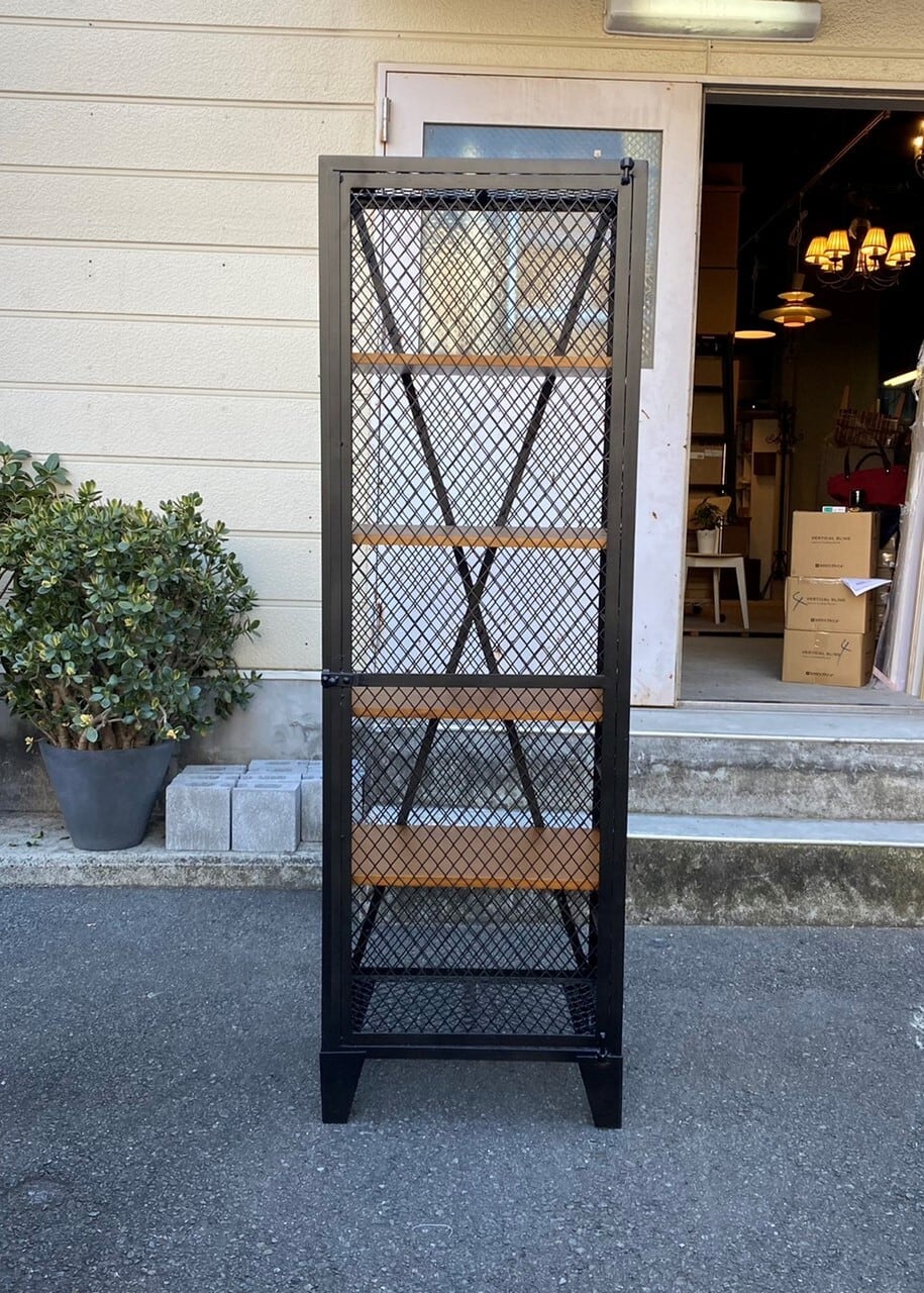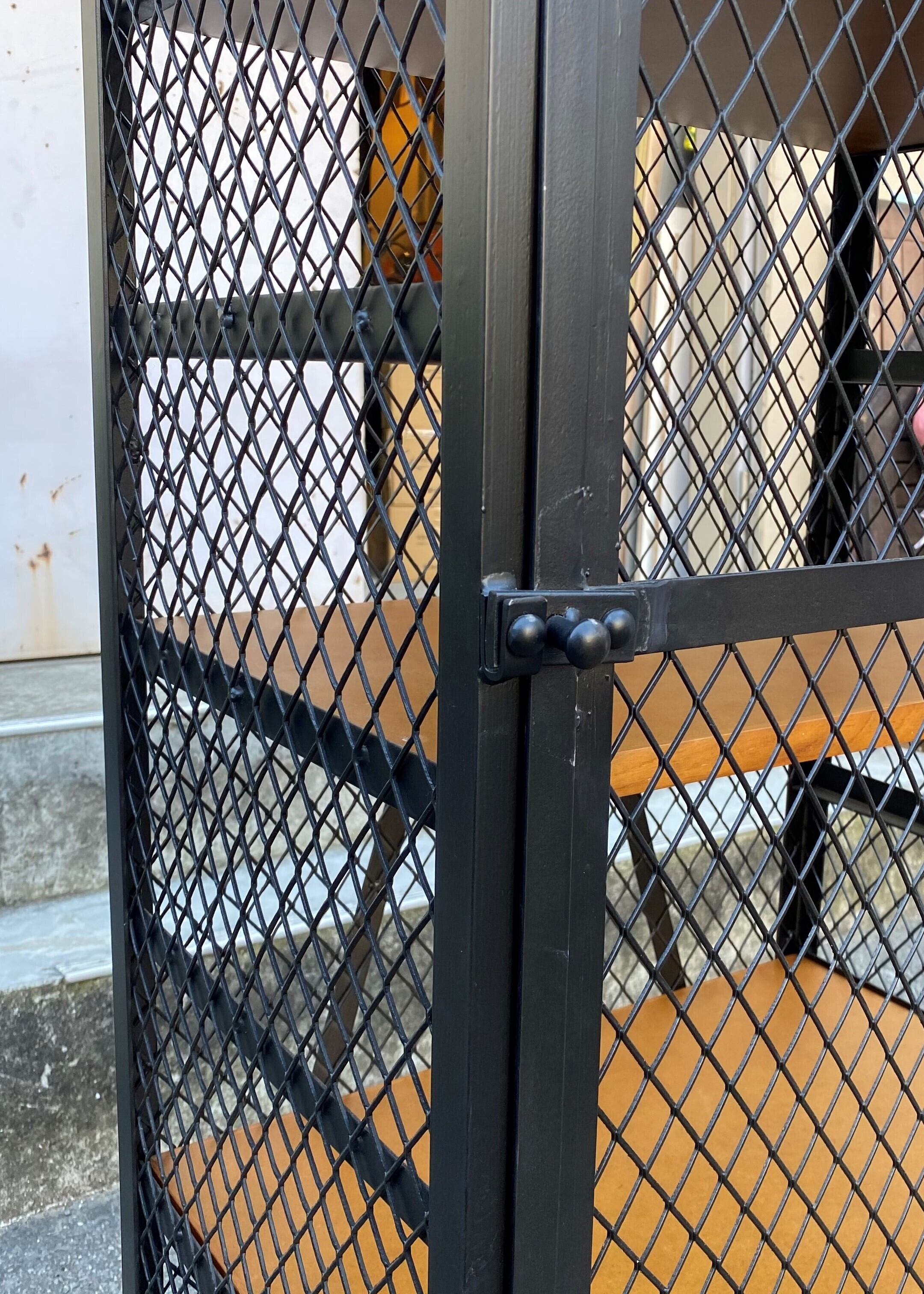 フェンス用の鉄網を使用したロッカーキャビネット。シューズやジーンズなどクローゼットにしまい込みたくないアイテムの収納に便利です。ディスプレイ棚としても飾る小物を引き立ててくれます。頻繁に使用するシャツやアウター類、カバンなどは、フックを使ってネット部分に引っ掛ける使い方もできます。棚板は16cmピッチで位置調節が可能です。
